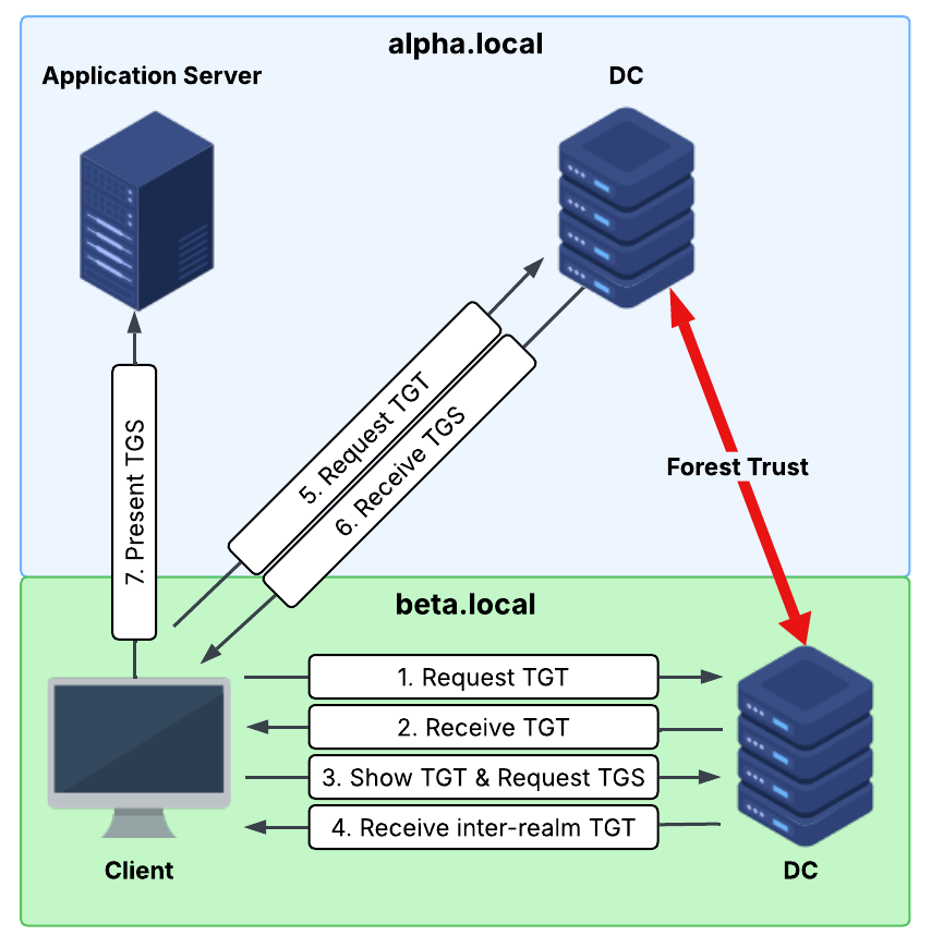 The diagram above illustrates the Kerberos authentication flow between two forests: alpha.local and beta.local, which are connected via a forest trust. When a client from the beta.local domain attempts to access a service hosted in the alpha.local domain, the following process happens: